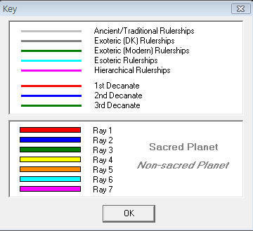 A nifty little Windows program that enables you to see the traditional (or ancient), modern, esoteric and hierarchical sign rulerships and decanate rulerships at a glance. These include those rulerships which are described in the book Esoteric Astrology by A.A.Bailey, Publ. The Lucis Trust. Useful for students of Esoteric Astrology. Colourful and graphical.